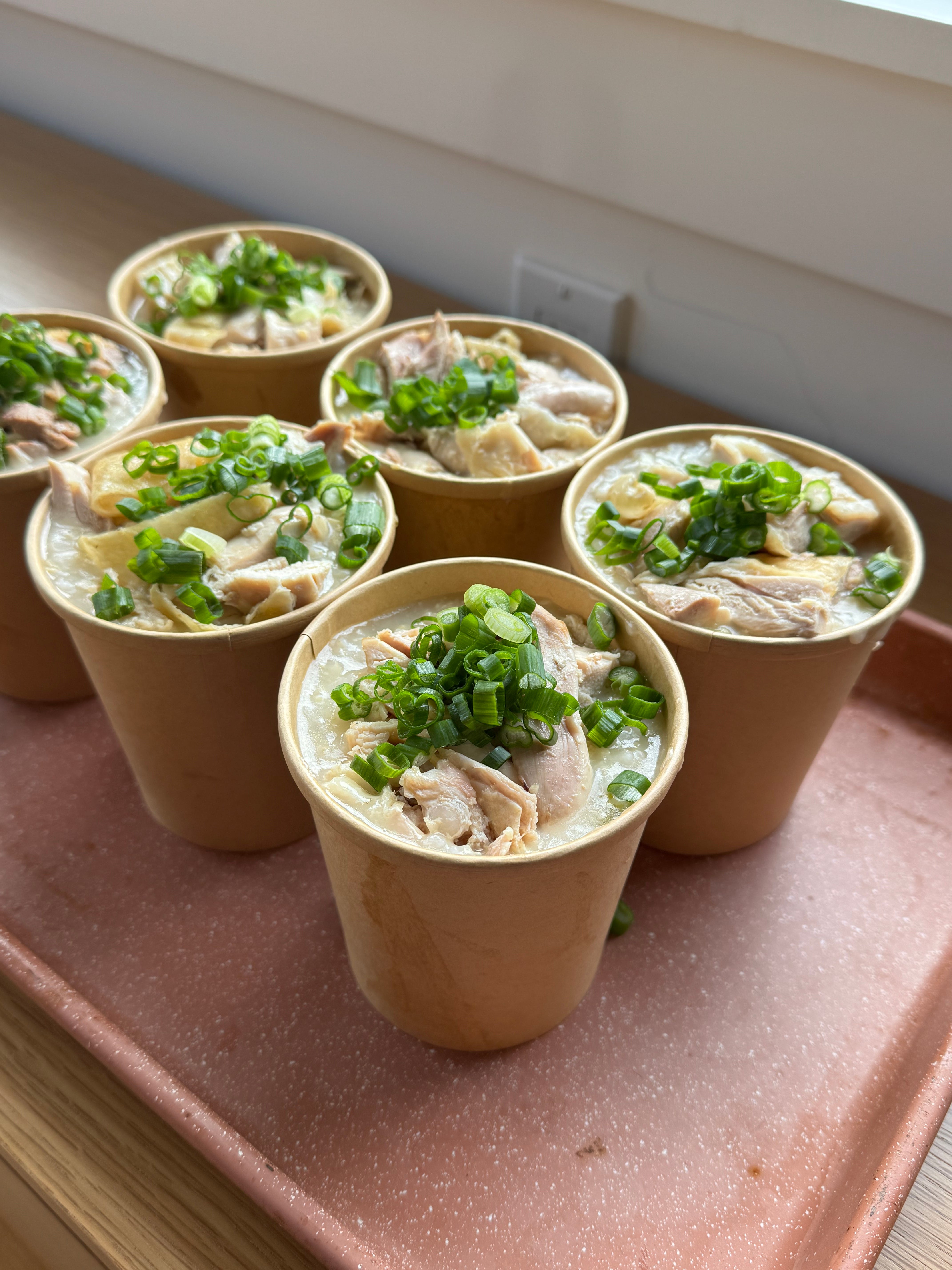 This is the latest iteration of ginger chicken jook that I prepared and froze for myself. It uses a blend of jasmine, short grain brown rice, and millet for the grains, giving it a slightly nutty delicious flavor and a little more nutrition. Each portion gets an entire chicken thigh for protein and in the future when we reheat these again I’ll be topping with pork floss, some redskin peanuts, and maybe even a century egg!