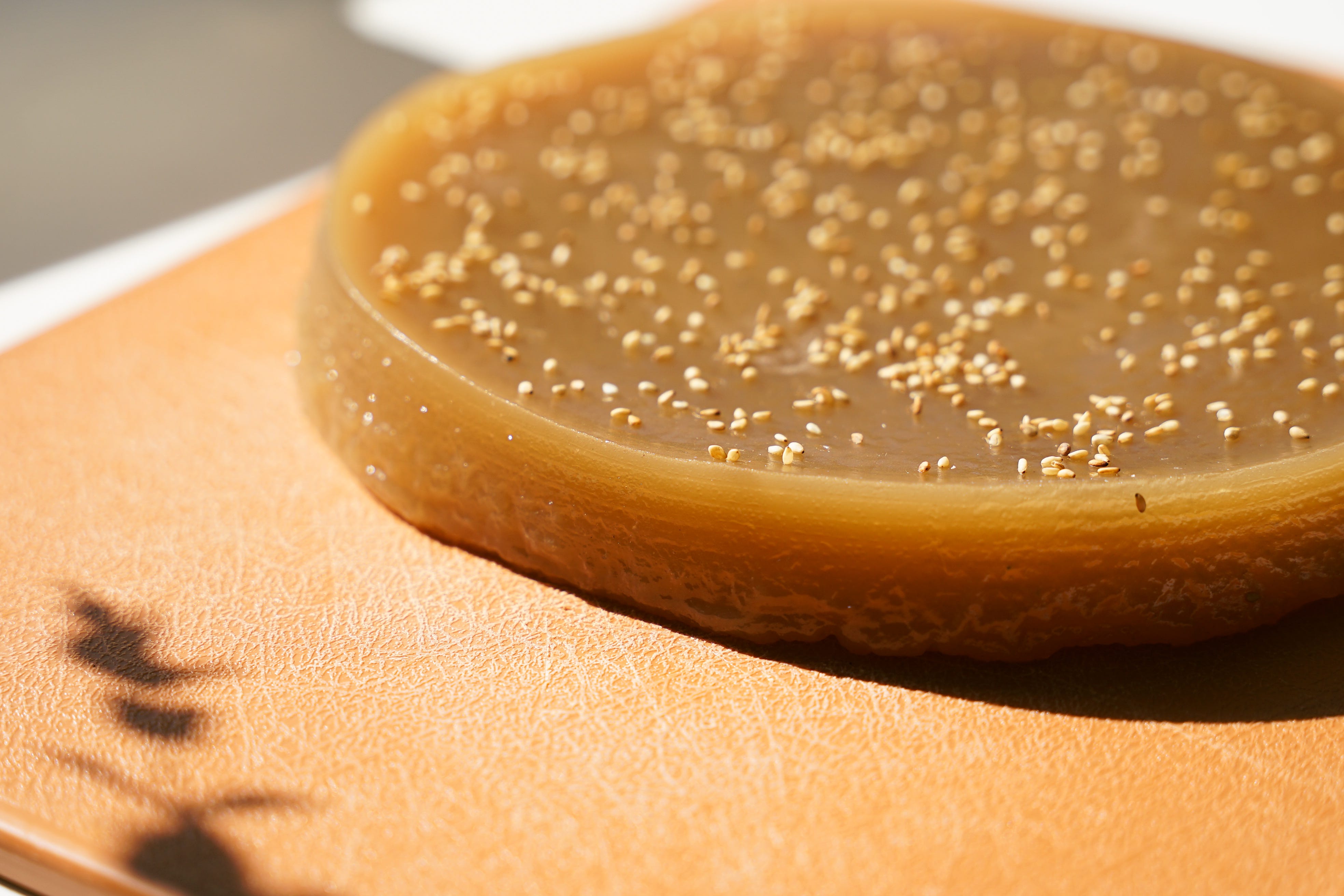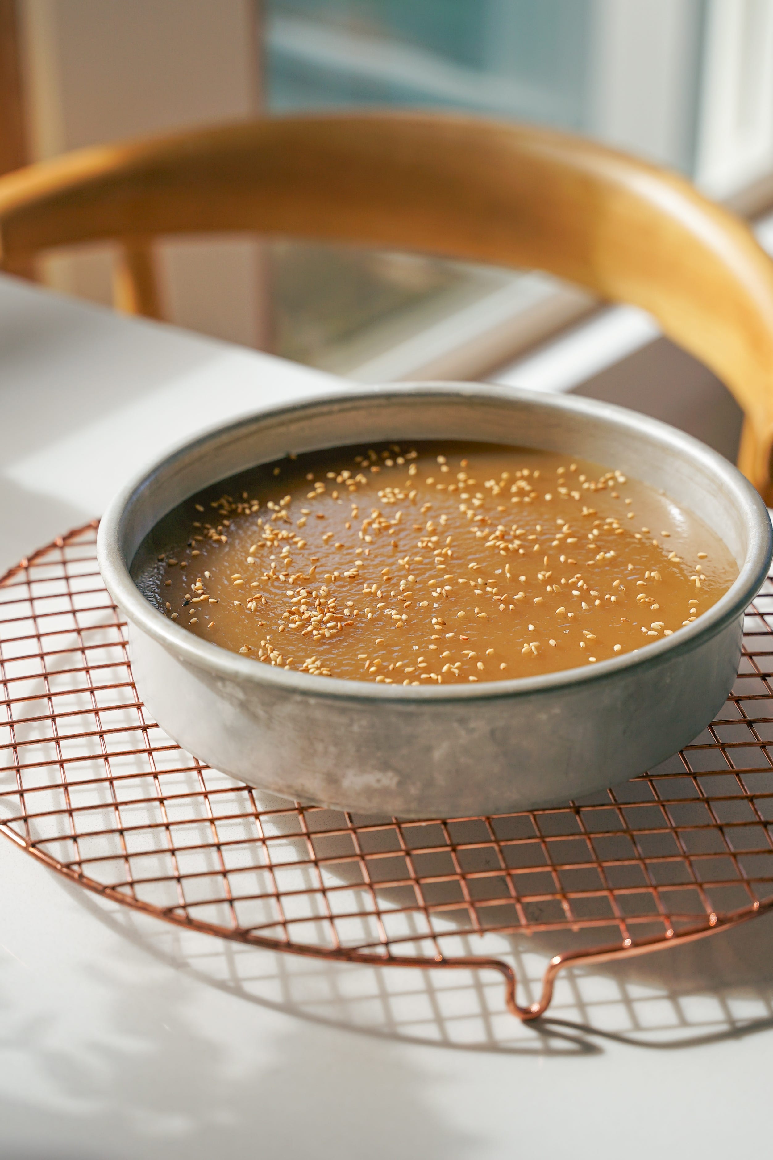 Prepare and warm up your steamer set up. Heat up the water until just barely simmering. Brush a 8” round cake pan (any similar size dish will work fine) with oil. Pour between 1/3 to 1/2 cup of batter into the pan (amount varies depending on the vessel). Place in the steamer and steam until the layer is set and translucent, 5 to 6 minutes. Give the batter a mix and then pour another layer. Steam and repeat until the cake has 8 layers. Sprinkle sesame seeds over the surface of the cake.