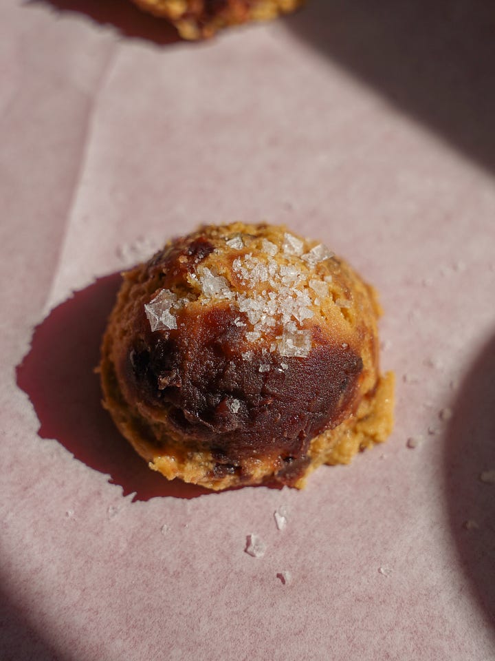 Without the red bean paste, this recipe makes a really really excellent peanut butter cookie. One that is big and craggily with a crispy edge and fudge-y soft center. It’s not too sweet, leaning slightly on the savory side which I very much enjoy. I like to add some sesame oil (another ingredient that I think is underutilized in baking) to amp up the nuttiness of the peanut butter. But once you add the red bean paste (store bought is fine! Order it or visit your local Asian market) it takes the cookies to another dimension, a dimension where school bake sales and mooncakes coexist. In the recipe I share a quick little trick to make sure the red bean paste makes an impactful appearance in each cookie, but it’s totally optional. And one more important feature of these cookies is the fact that they don’t require chilling before baking. I don’t know why but I have very little patience for chilling dough, if a recipe calls for a 24 hour rest time I can’t do it. For me it’s 1 hour max, but a no chill cookie dough is up my alley.
